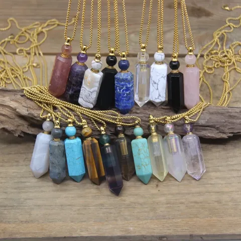 天然クリスタル弾丸香水瓶ペンダントネックレスファセットラピス黒曜石エッセンシャルオイルバイアルチャームシルバーリンク